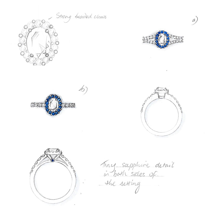 A key stage of the design process is usually the production of detailed hand-drawn designs by the designer, who works closely with the client. A hand drawing is often the best way to unlock the creativity of the mind, and to explore all the possible options. The designs are all to scale and draw on the collective experience of the designer, the gemmologist and the workshop to produce pieces that, while beautiful and unique, are also achievable in the workshop.
